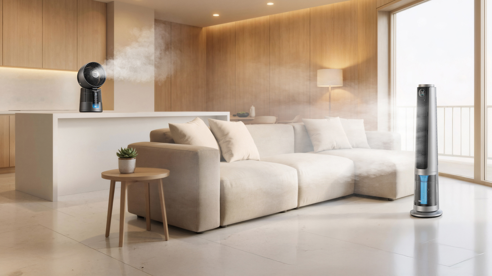 Le système repose sur un principe d’atomisation ultrasonique. L’eau est transformée en une brume de micro-gouttelettes extrêmement fines. L’appareil intègre ensuite ces particules directement dans le flux d’air de manière contrôlée. Contrairement aux appareils basiques, la brume et l’air circulent dans des circuits distincts avant la diffusion finale. L’objectif est de ne conserver que les particules les plus légères, ce qui favorise une évaporation quasi immédiate dès la sortie de la grille. Résultat affiché : l’air se refroidit efficacement, mais les surfaces environnantes restent sèches.