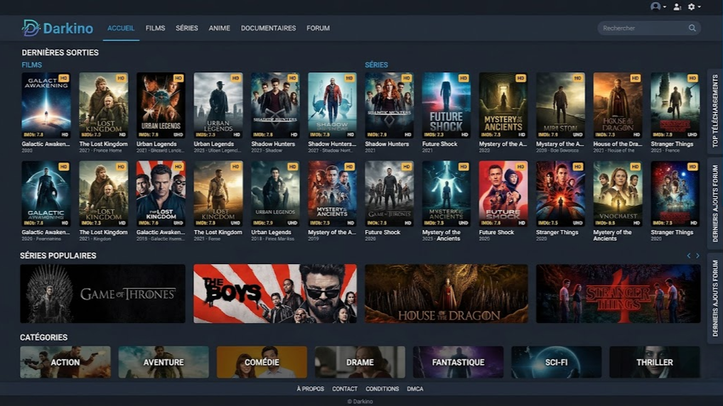 Darkino est une plateforme de streaming largement connue dans le monde francophone pour son catalogue varié de films, séries, animés et documentaires accessibles gratuitement. Ce site, qui portait auparavant le nom de Tirexo, a su capter l’attention des amateurs de divertissement en ligne grâce à son offre diversifiée et son interface conviviale.